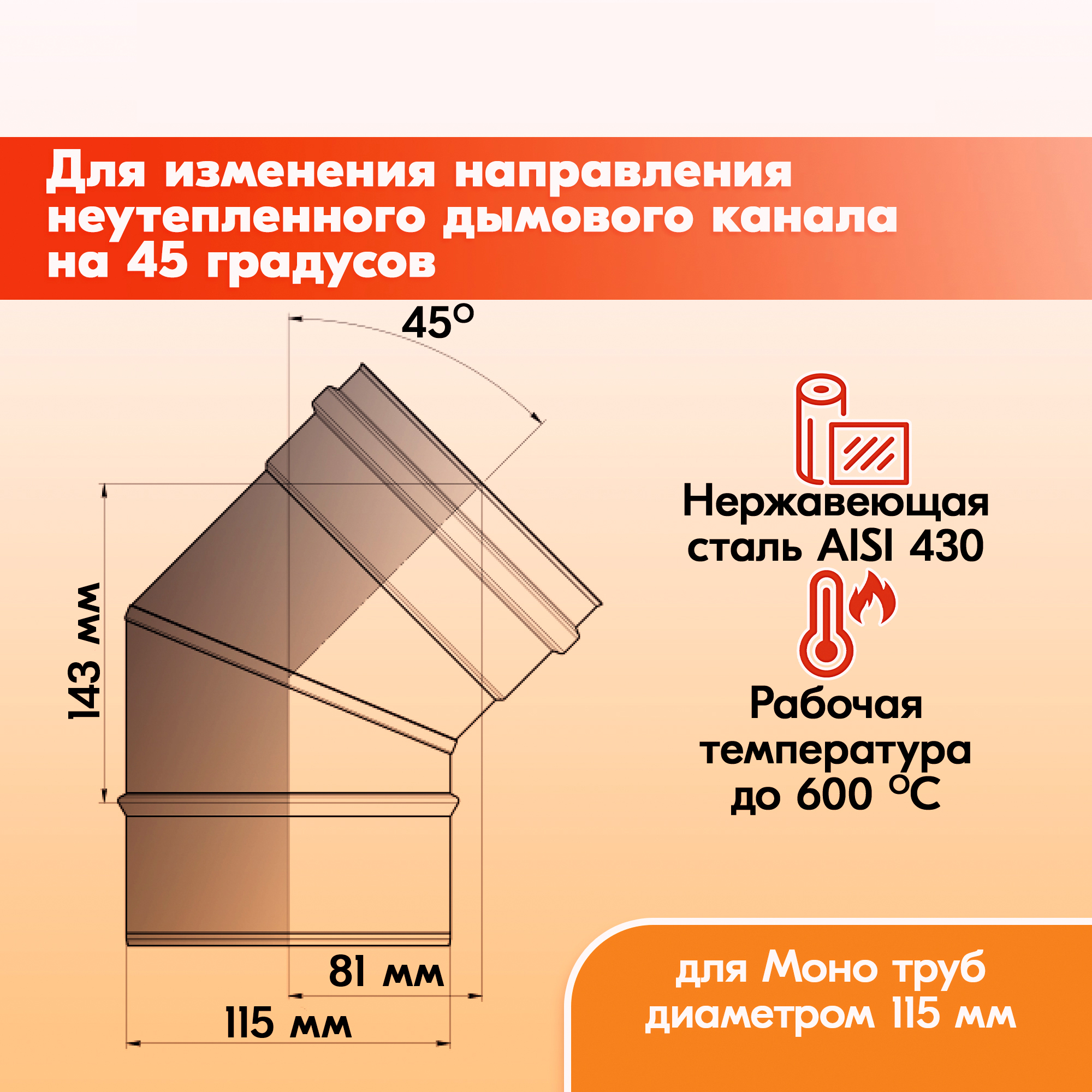 Отвод для дымохода Моно ОМ-Р от производственной компании Теплов и Сухов является элементом дымоходной системы и предназначен для изменения направления неутепленного дымового канала на 45 градусов или 87 градусов в зависимости от конфигурации.