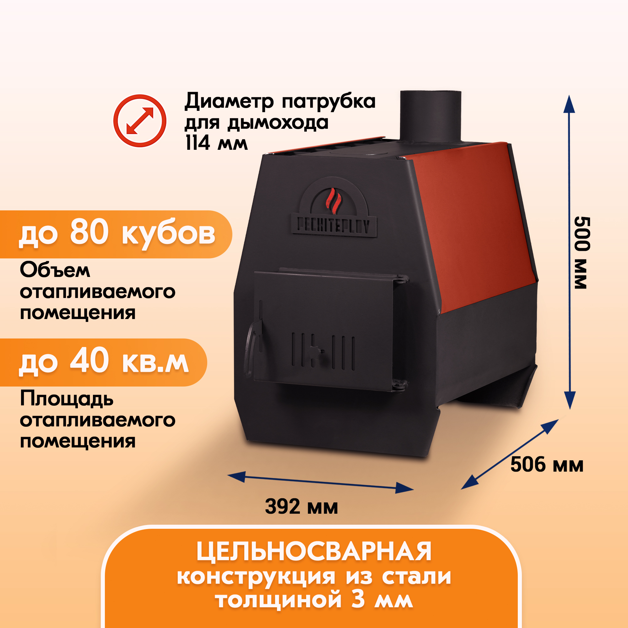 Печи отопительные PECHITEPLOV на 50 и 80 кубов, имеют компактные размеры и небольшую массу, поэтому их легко переместит с места на место и смонтирует один рабочий.