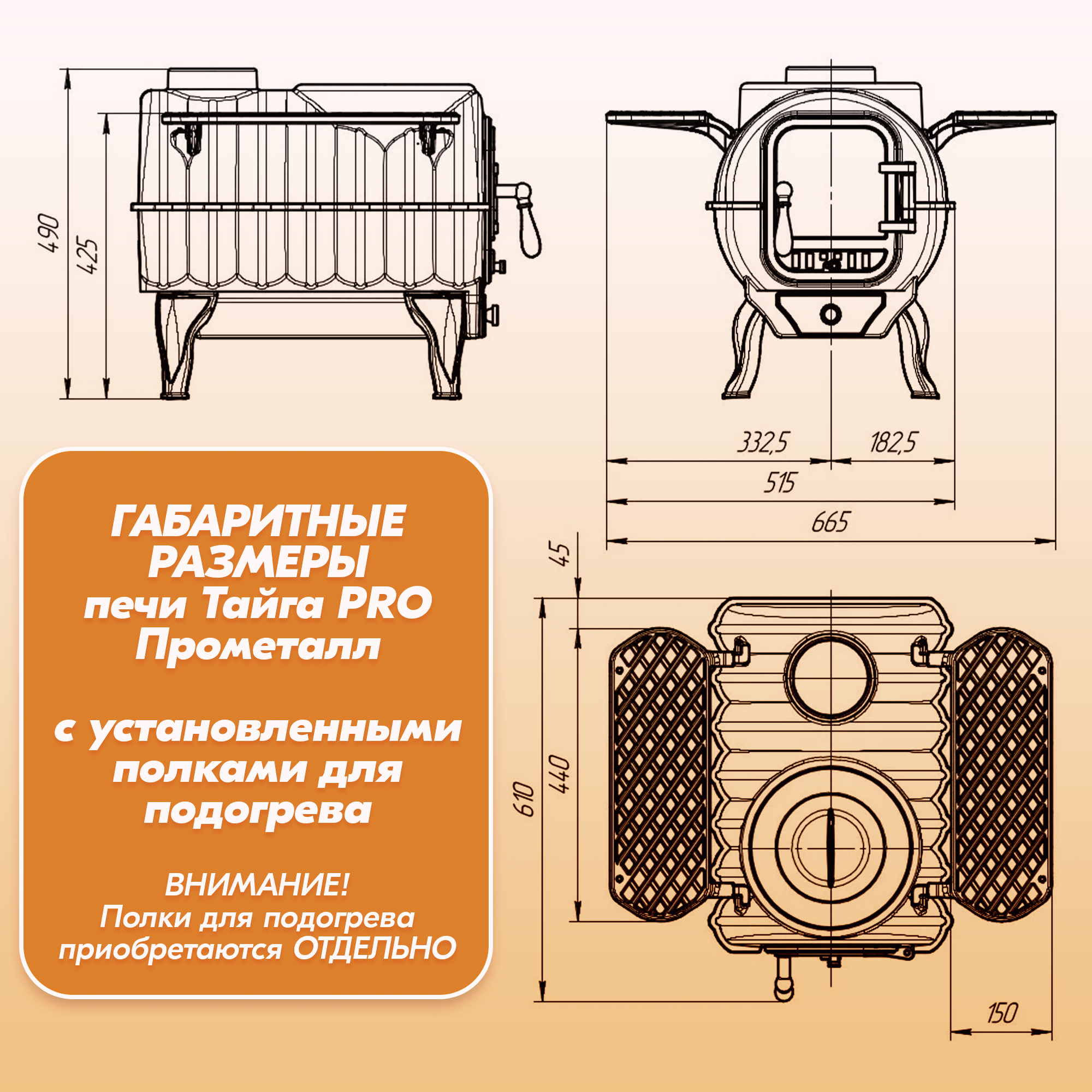 Печь отопительно-варочная Прометалл «Тайга» PRO - универсальная модель, сочетающая в себе максимум достоинств: быстрый нагрев помещения, высокую теплоотдачу, герметичную конструкция и длительное горение в режиме тления.