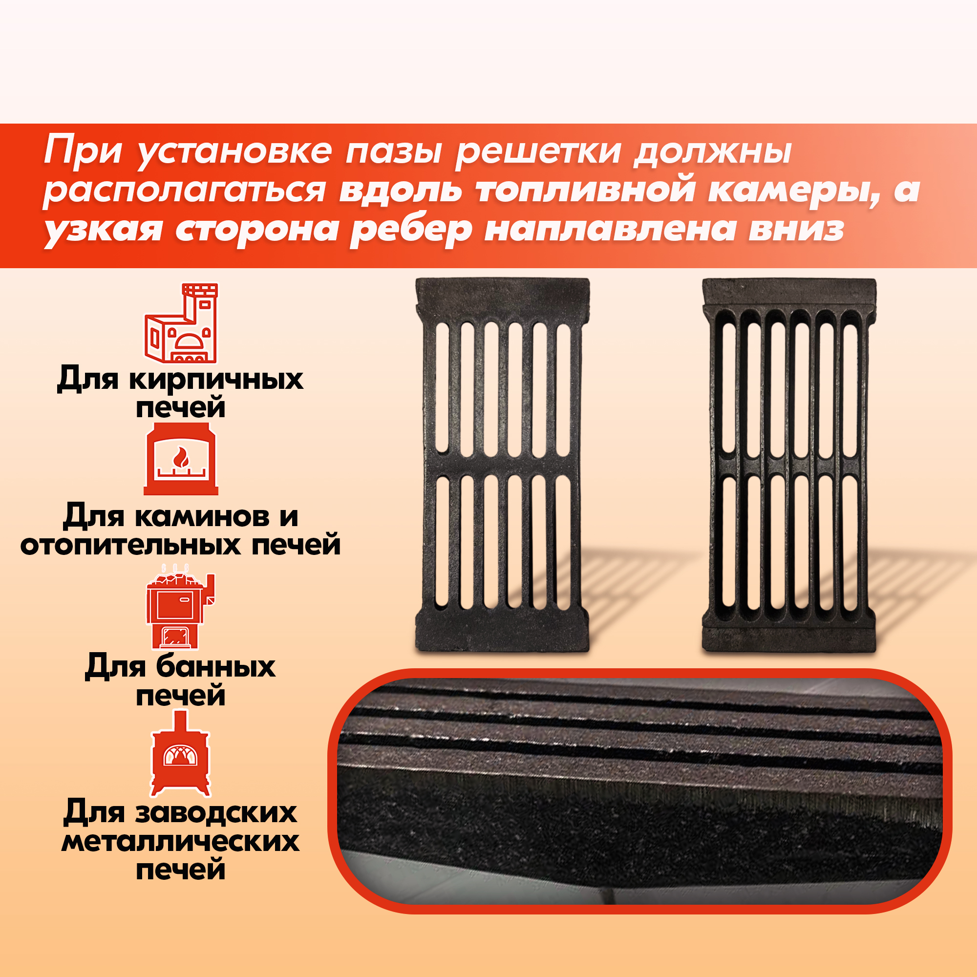 Колосник устанавливается в нижней части топки, над поддувалом, таким образом, чтобы пазы были направлены вдоль топливника (от дверки к задней стенке).