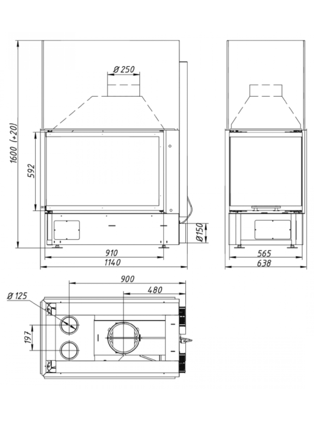 Габариты каминной топки: высота: 1630 мм, ширина: 644 мм, глубина: 1149 мм. Вес 426 кг.