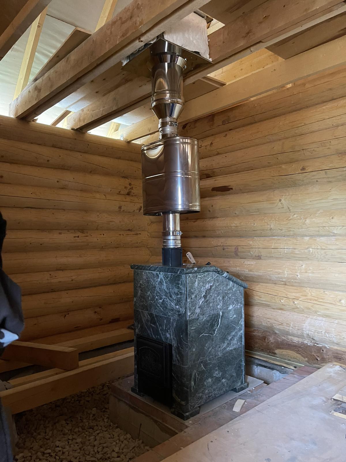 Монтаж Печь банная НМК Сибирь 25 с ЗК без ВТК в облицовке "Президент" змеевик (дверка без стекла), сборка облицовки, установка дымохода.
