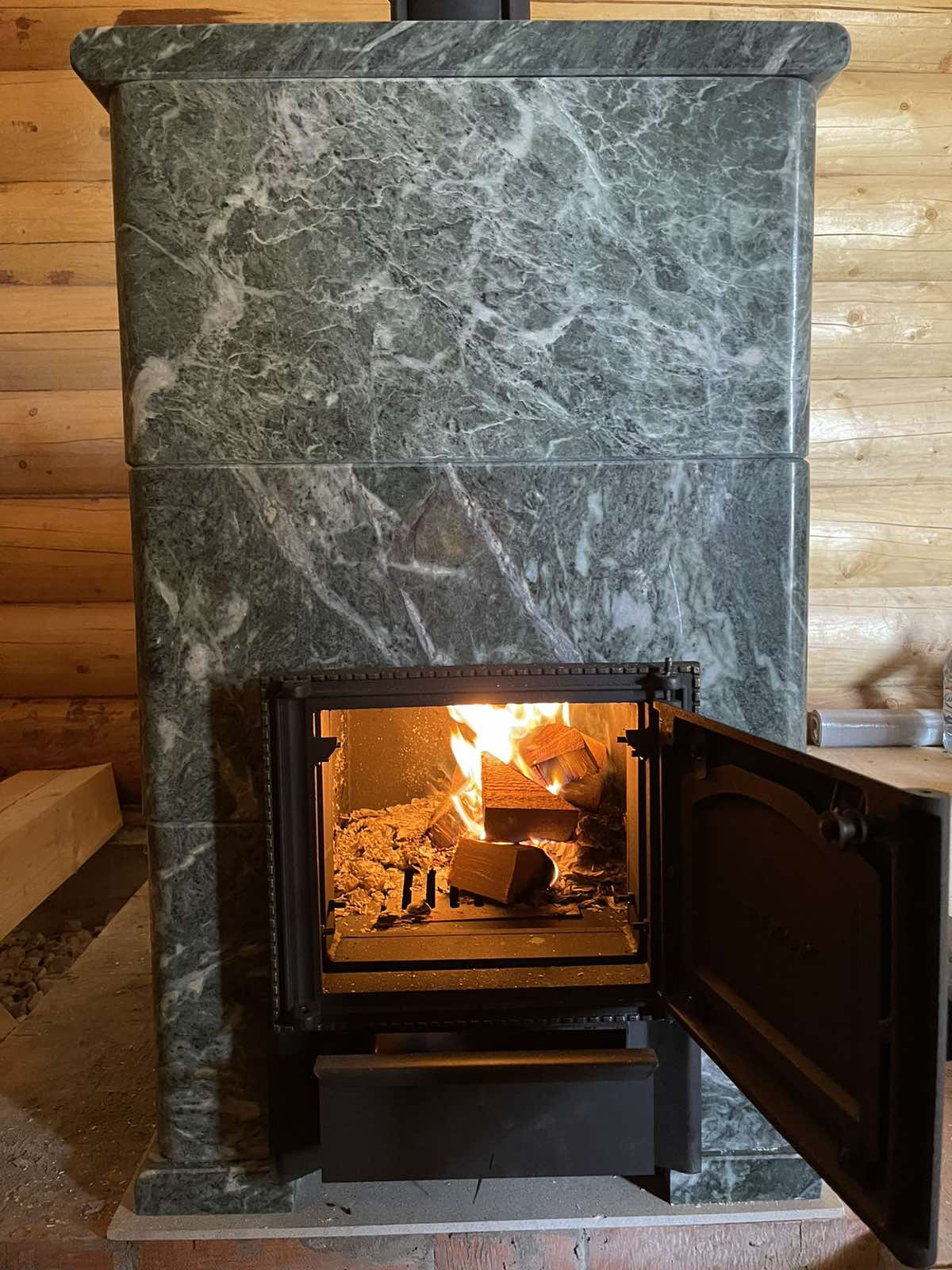 Монтаж банная печи НМК Сибирь 25 с закрытой каменкой в облицовке "Президент"