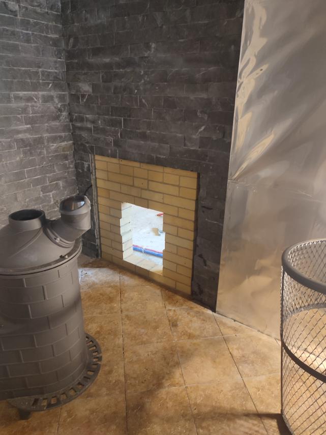 Монтаж печи Атмосфера с установкой коплекта дымохода и кирпичного портала.